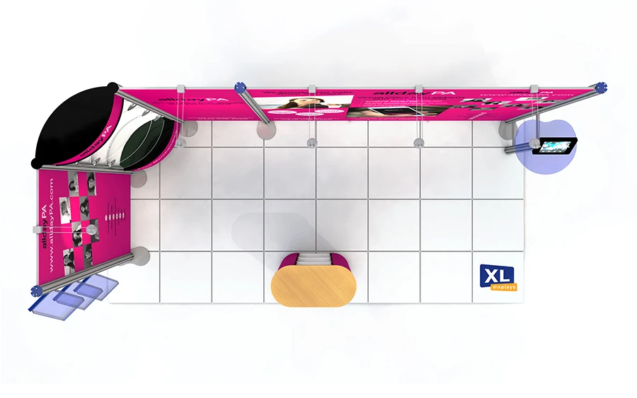 This L-shaped Centro exhibition stand will suit a 2m x 4m exhibition stand space. The popular design which features two open sides allows easy access for visitors and provides maximum visibility for passers-by.