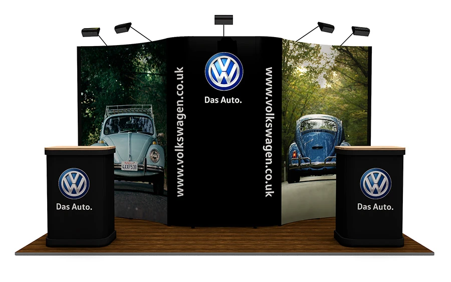The 2m x 4m linked pop up system is made up of a 3×1 pop up frame and two 3×2 curved pop up frames, cleverly joined together with linking graphic panels to create a professional exhibition back wall.