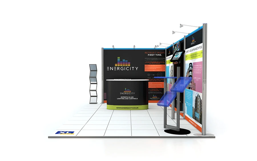 The 5m x 3m L-shape Centro display system is a large exhibition stand which is open on two sides. This popular stand design allows for easy visibility of your brand and easy access to your stand.