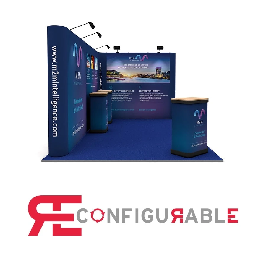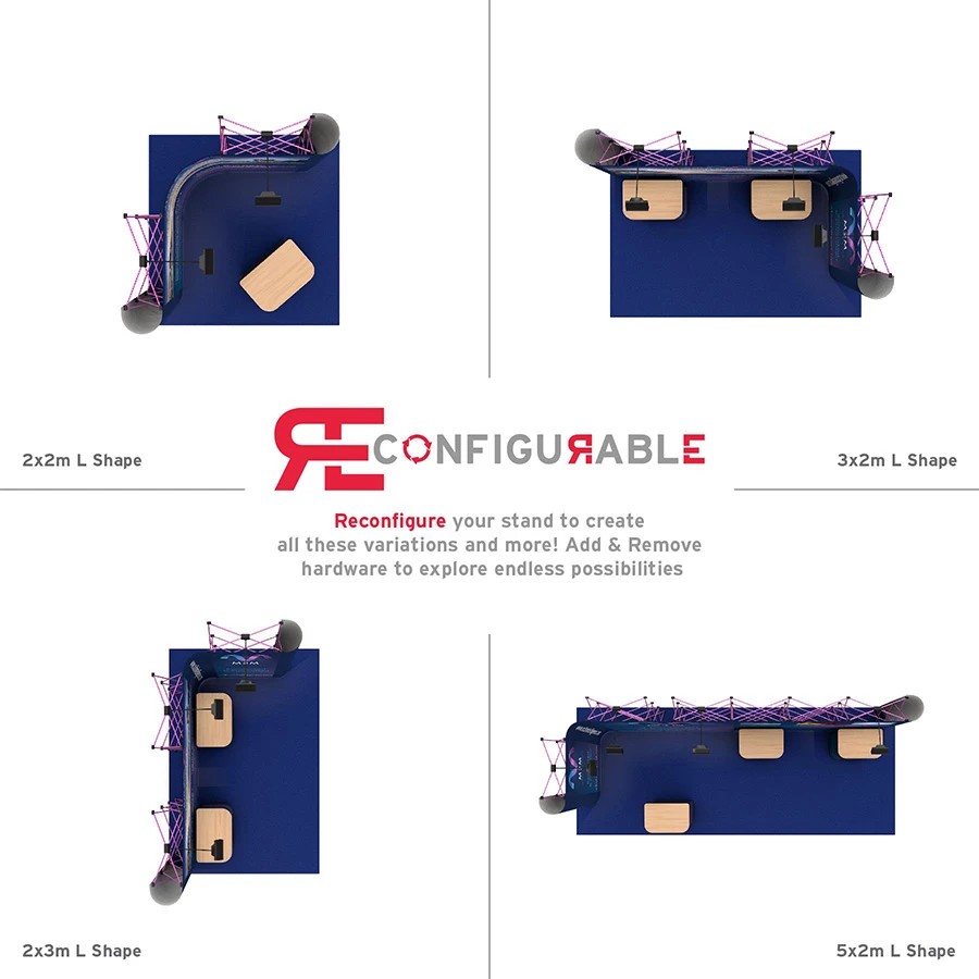This linked pop up exhibition stand is suitable for a 5m x 3m exhibition space and can be configured in an ‘L’ shape on either the right or left side of the stand.