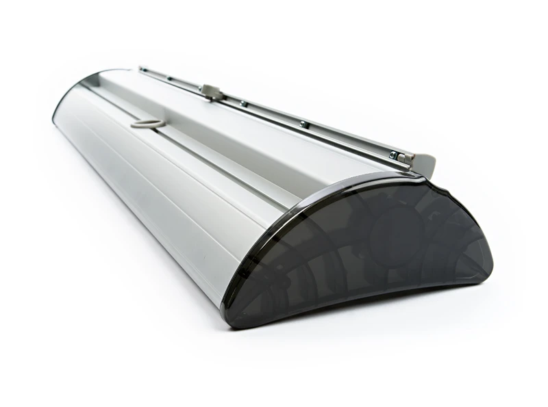 Complete with a premium anodised aluminium base that the printed banner retracts into when not in use, durable hybrid pole, removable charcoal grey end plates and a ratchet tensioner system and integral pole storage in the base of the banner stand.