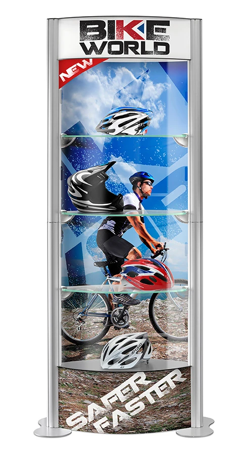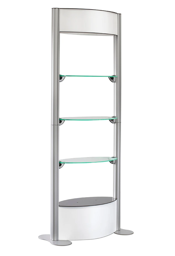 The display pod is 2m high and provides plenty of display space for products with 3 oval-shaped shelves and base shelf. Made from acrylic, the shelves are 8mm thick with a ‘green edge’. This Centro stand has a unique RotrLink connection system which makes installation quick and easy – the poles simply twist and lock together to create a strong and sturdy frame.