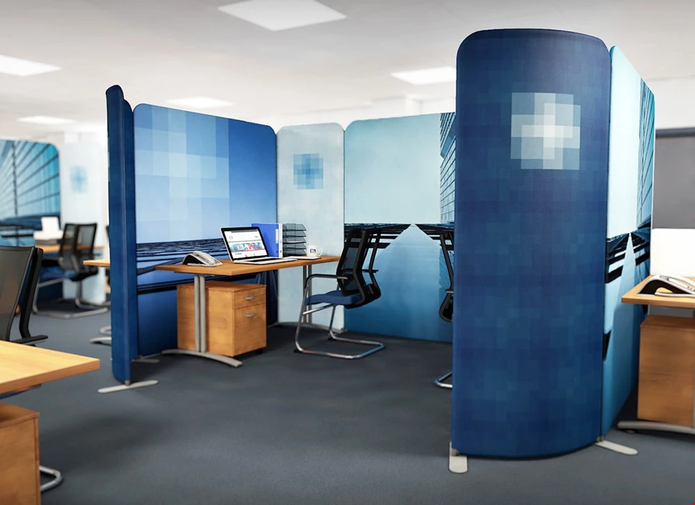 We supply double-sided printed graphics as standard. The printed, one-piece printed fabric sock slides over the top and zips up at the bottom to reveal a seamless, tensioned printed office divider with 360° branding that can be Pantone matched to your company branding.