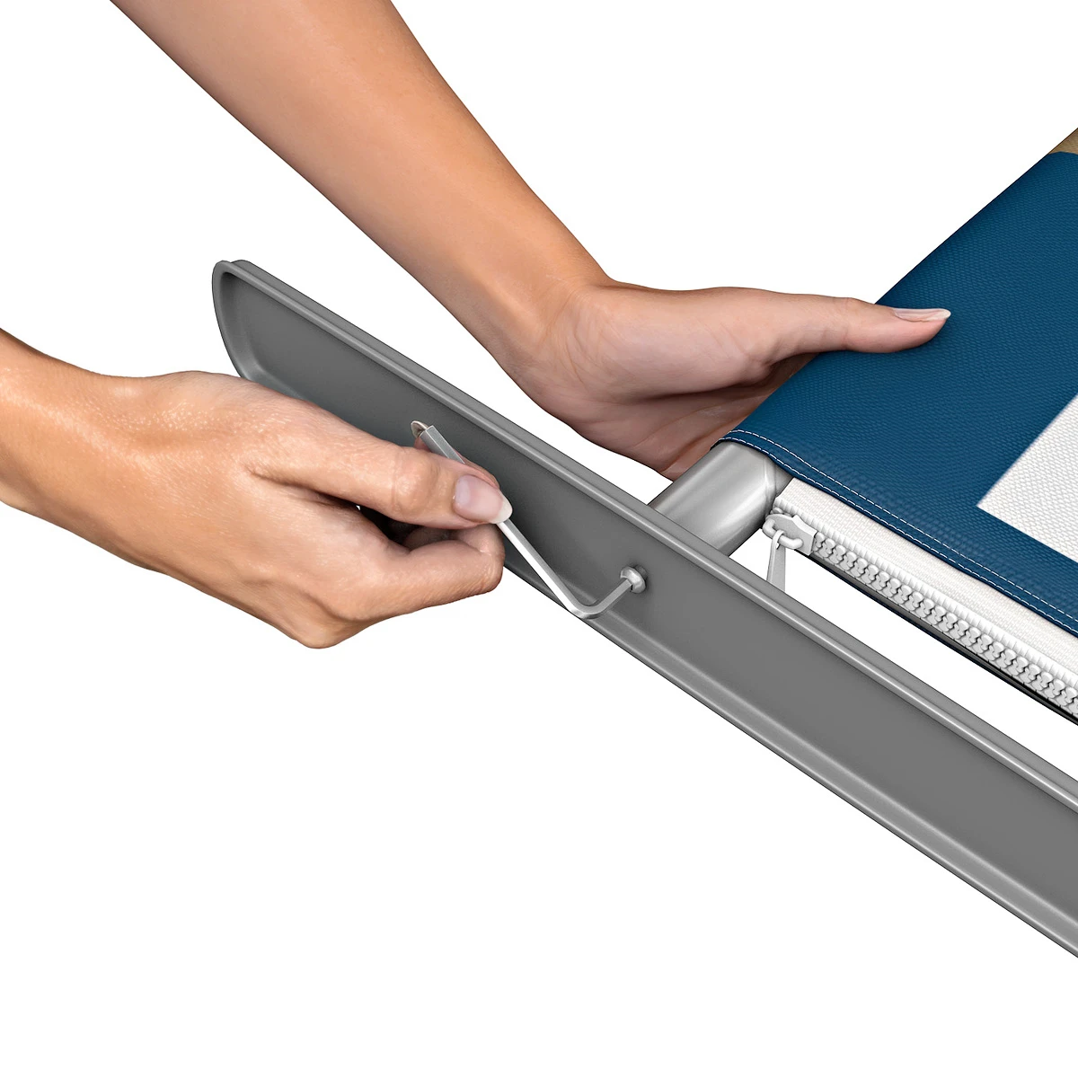 The stabilising feet attach to the bottom of the aluminium frame using an Allen key for stability. Finally, the one-piece printed fabric graphic slides over the top of the frame and zips up at the bottom to reveal a seamless, tension fabric exhibition stand.