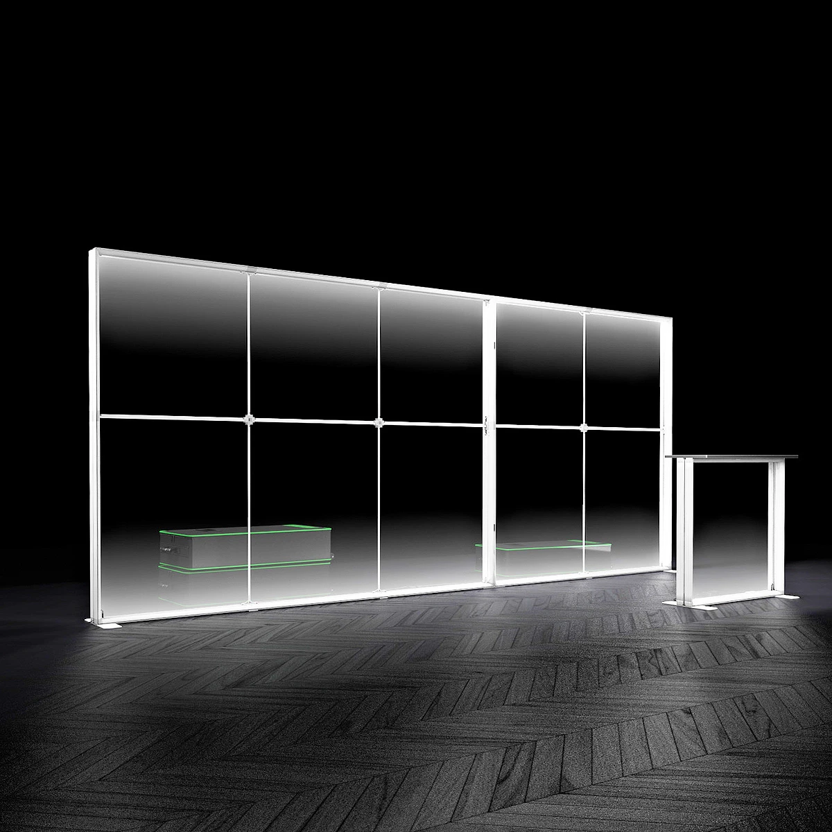 Alongside the two exhibition light boxes, this kit includes two FABRILUX® Square Feet For SEG Lightboxes and two FABRILUX® Joining clips For SEG Lightboxes. It is also possible to upgrade your lightbox exhibition stand with a 1000mm x 1000mm FABRILUX® Lightbox Counter.