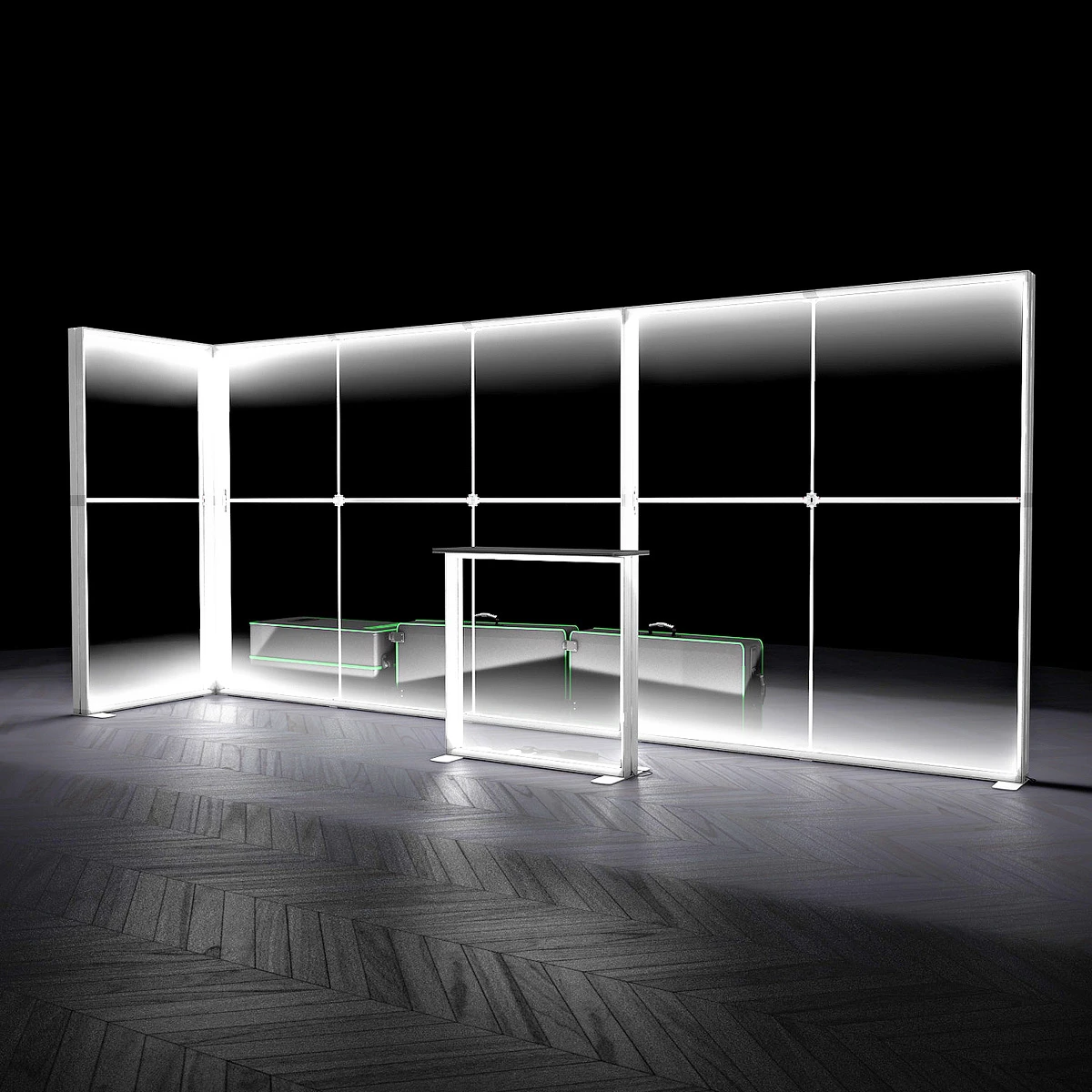 Create a striking exhibition, event or retail display using this L-shaped LED lightbox kit. This FABRILUX® Lightbox exhibition stand comprises one SEG fabric lightbox 2250mm x 3000mm panel, one SEG fabric Lightbox 2250mm x 2000mm panel and one 2250mm x 1000mm panel linked at a 90-degree angle to form a corner-shaped exhibition display stand. Easy to use, transport, store and assemble; these intelligent but simple illuminated displays are the ideal product for your exhibition collection.