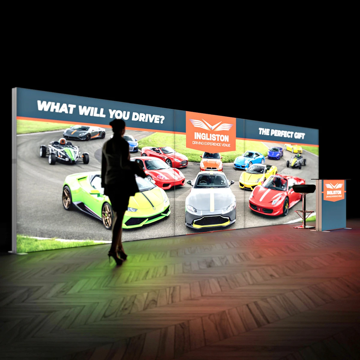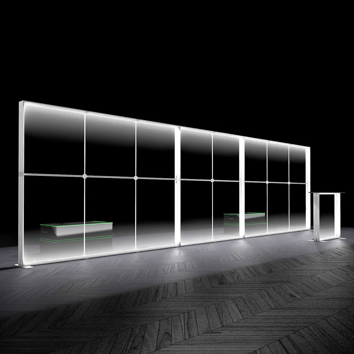 - Made up of 3x Backlit Exhibition Stands; two 3m x 2.5m and one 2m x 2.5m