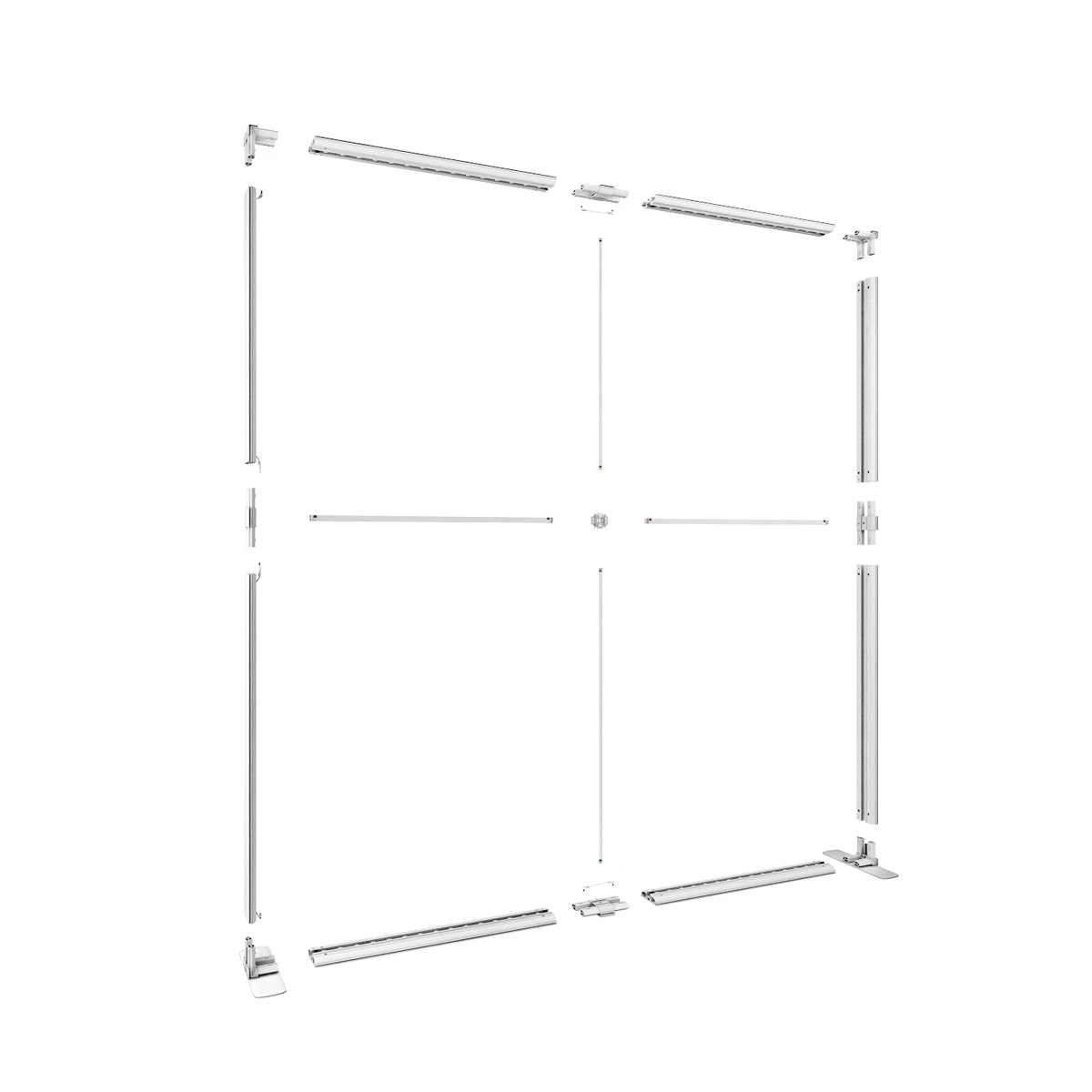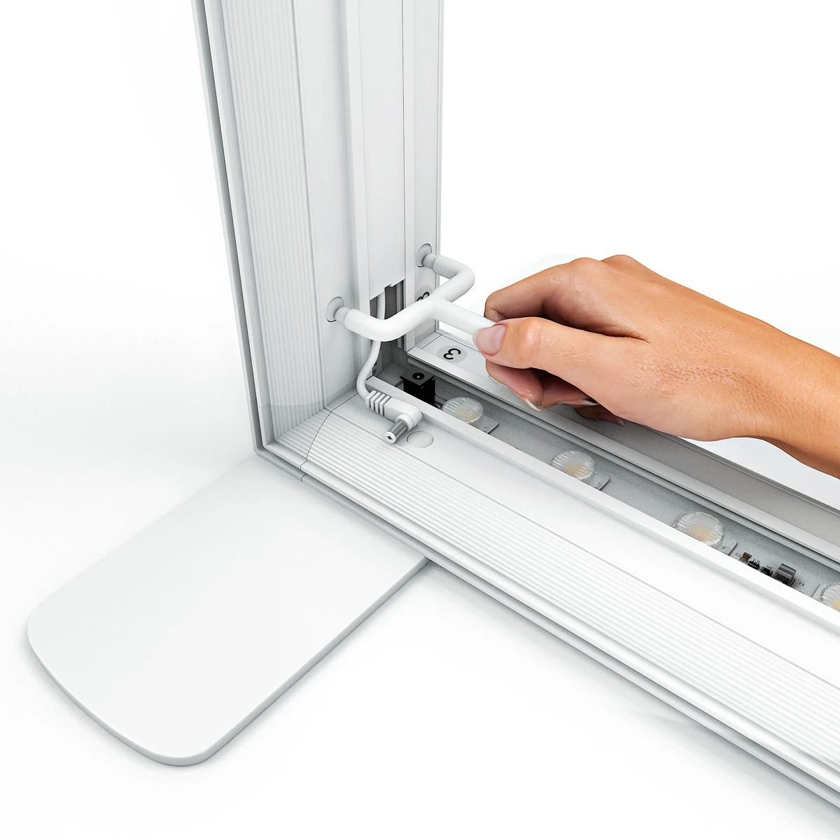 No tools are required for assembly. FABRILUX® frame parts are numbered for push fit self-assembly. Match the part numbers, slide the frame pieces together, connect the internal cables and then install the backlit graphics into the frame channels. Just plug in the LED Lightbox and you are ready to go.