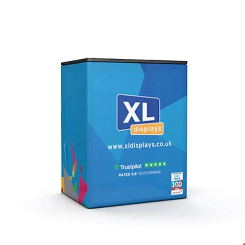 Once the framework has been assembled, the tension fabric graphic effortlessly slides over the frame and zips up along the bottom, securing it in place. The black top sits on top and the plastic mouldings sit inside the top section of the framework keeping it firmly in place.