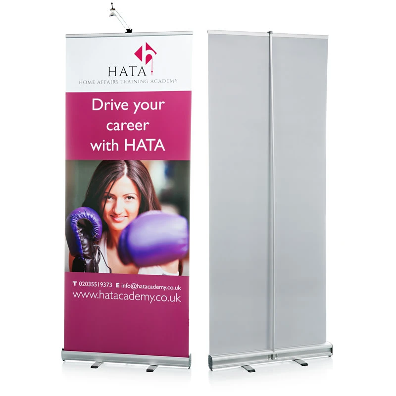Extremely portable and easy to assemble. Complete with a premium anodised aluminium base that the printed banner retracts into when not in use, full colour print, swivel-out stability feet and fabric carry bag.