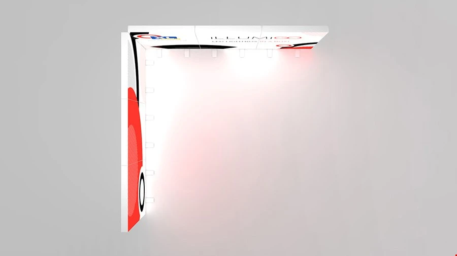 This 3×3 L-shaped corner exhibition stand is comprised of six iLLUMiGO™ LED banners which – when placed next to each other – create a high impact portable lightbox display that can fit into a 3.5m x 3.5m exhibition space.