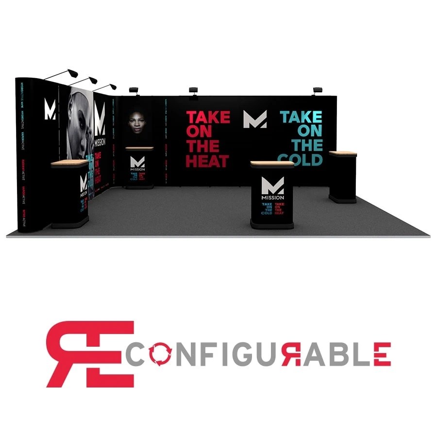 The 5m x 6m l-shaped linked pop up stand is a simple, yet impressive exhibition display that features plenty of area to promote your product and your brand.