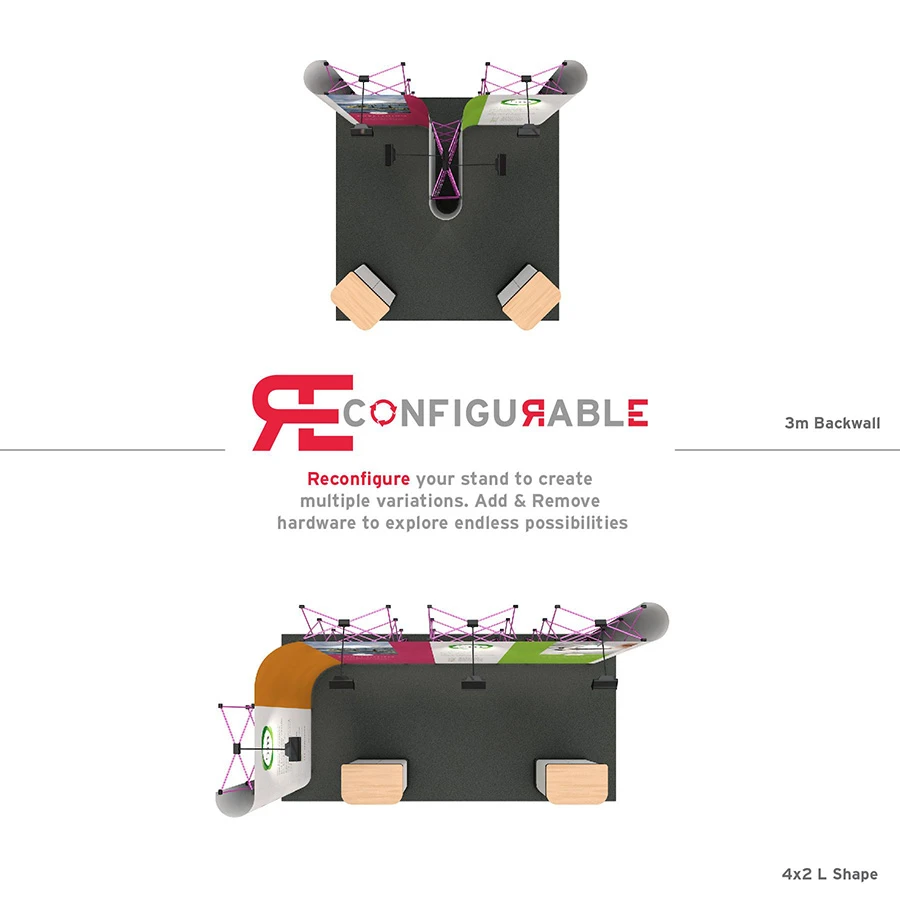 The 3m x 3m exhibition stand is the perfect choice if you’re short on space but still want to create an impact. The large graphic area provides plenty of space for marketing your message effectively.