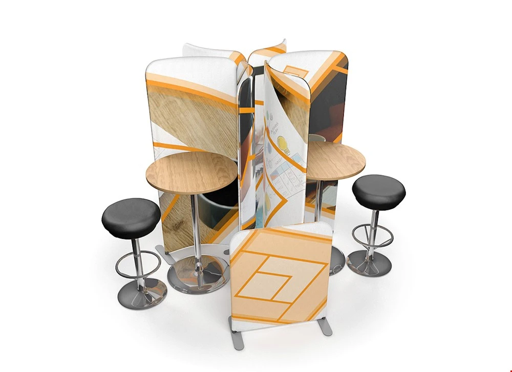 This printed office pod kit can be used in the configuration shown in the image. Alternatively, the individual linking screens can be set into almost any configuration and can be placed in many different applications as smaller screen solutions to enforce social distancing measures.