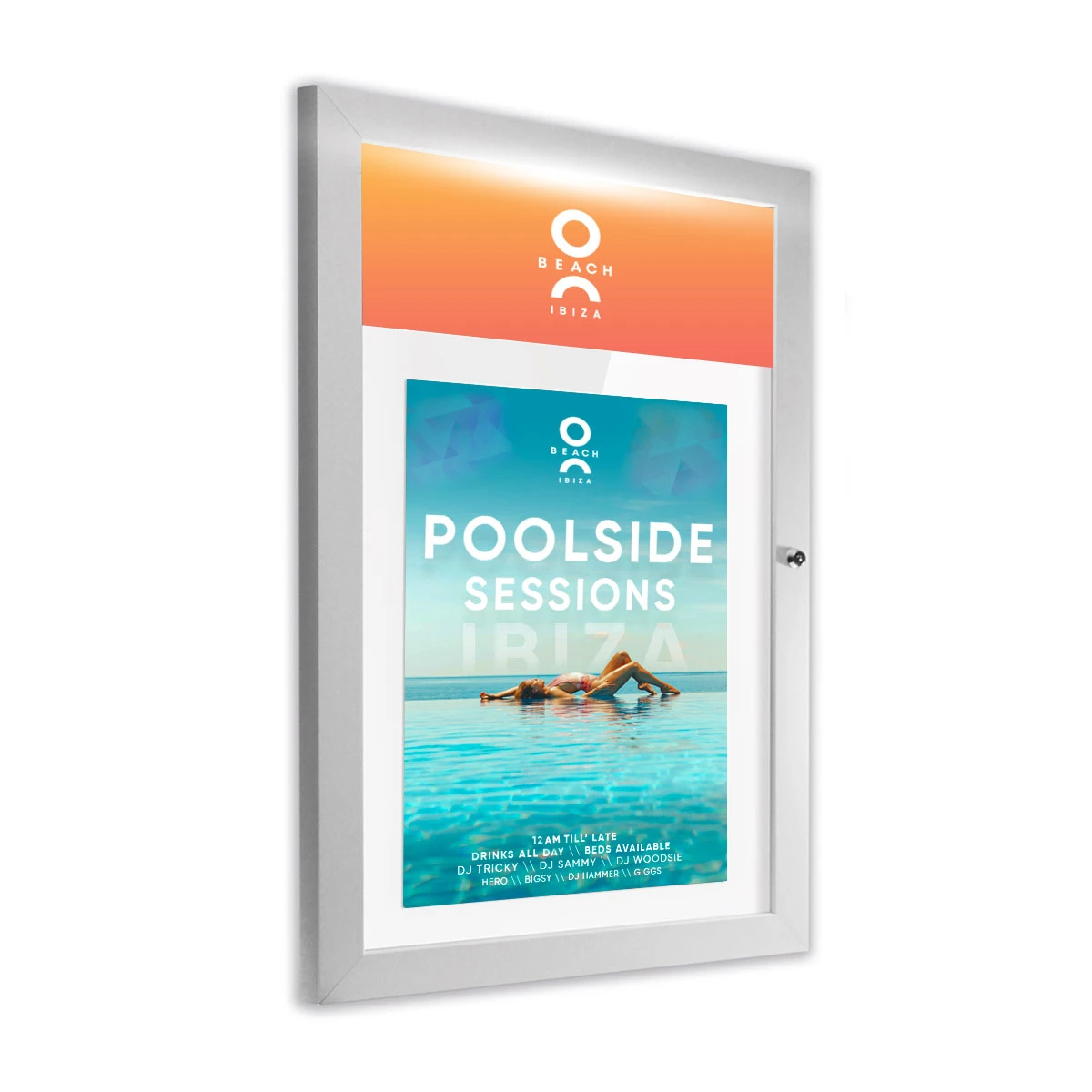 Designed to support menu displays for restaurants, bars, pubs, clubs, cafes, delis and other kinds of hospitality and entertainment venues, as well as theaters, hotels, salons and hairdressers, this display case is illuminated with a strip of LED lighting along the top of the poster frame behind the header panel section.
