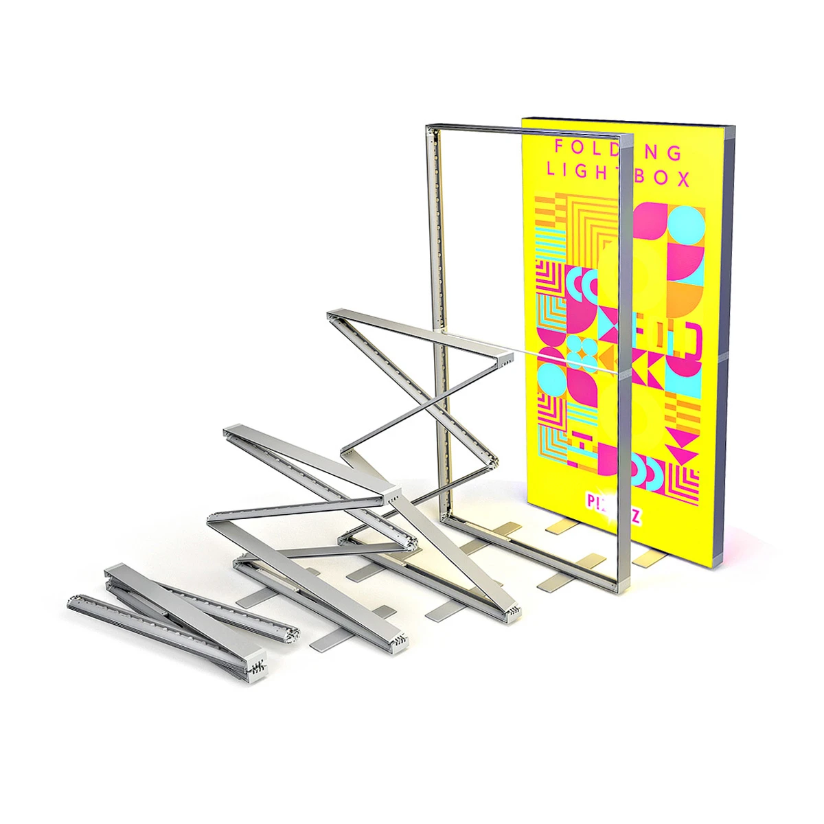 The folding pop-up frame is constructed from lightweight aluminium and has integrated TFS channelling to support and display tension fabric graphics. Double sided lightbox printing is included within the price on the PIZAZZ® LED Lightbox range.