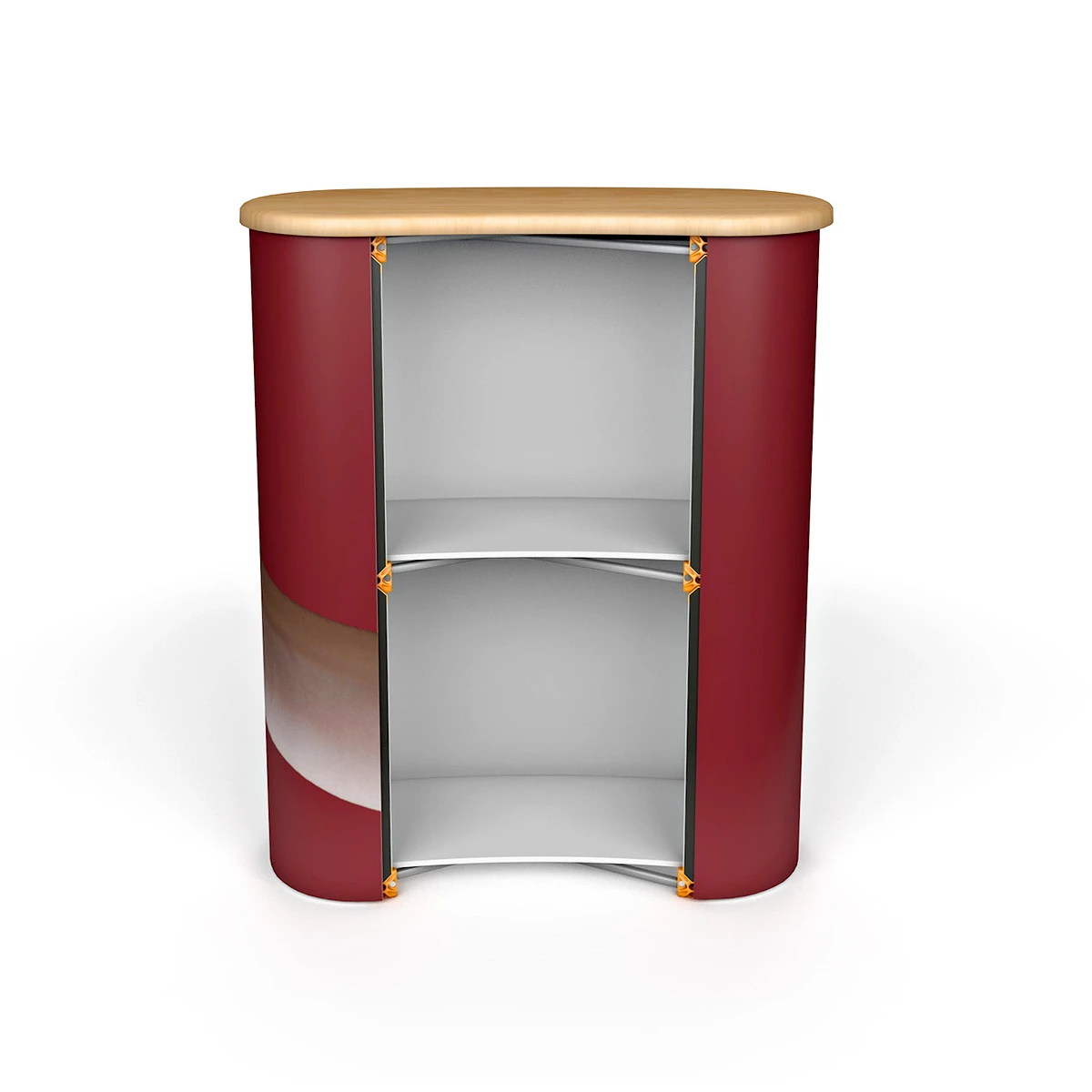 The frame is magnetic and self-locking allowing you to set the counter up in a matter of minutes. Simply pop up the frame which snaps together, attach the countertop, wrap the magnetic graphic panel around the sides and front of the counter and finally, fit the internal shelves into place.