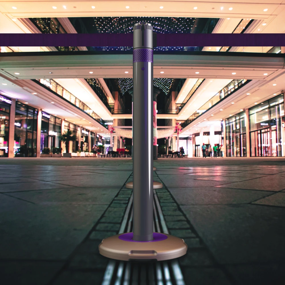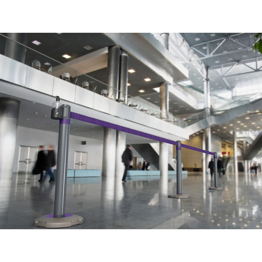 - 1 weighted post with retractable belt in 5 finishes: purple, blue, green, red & grey