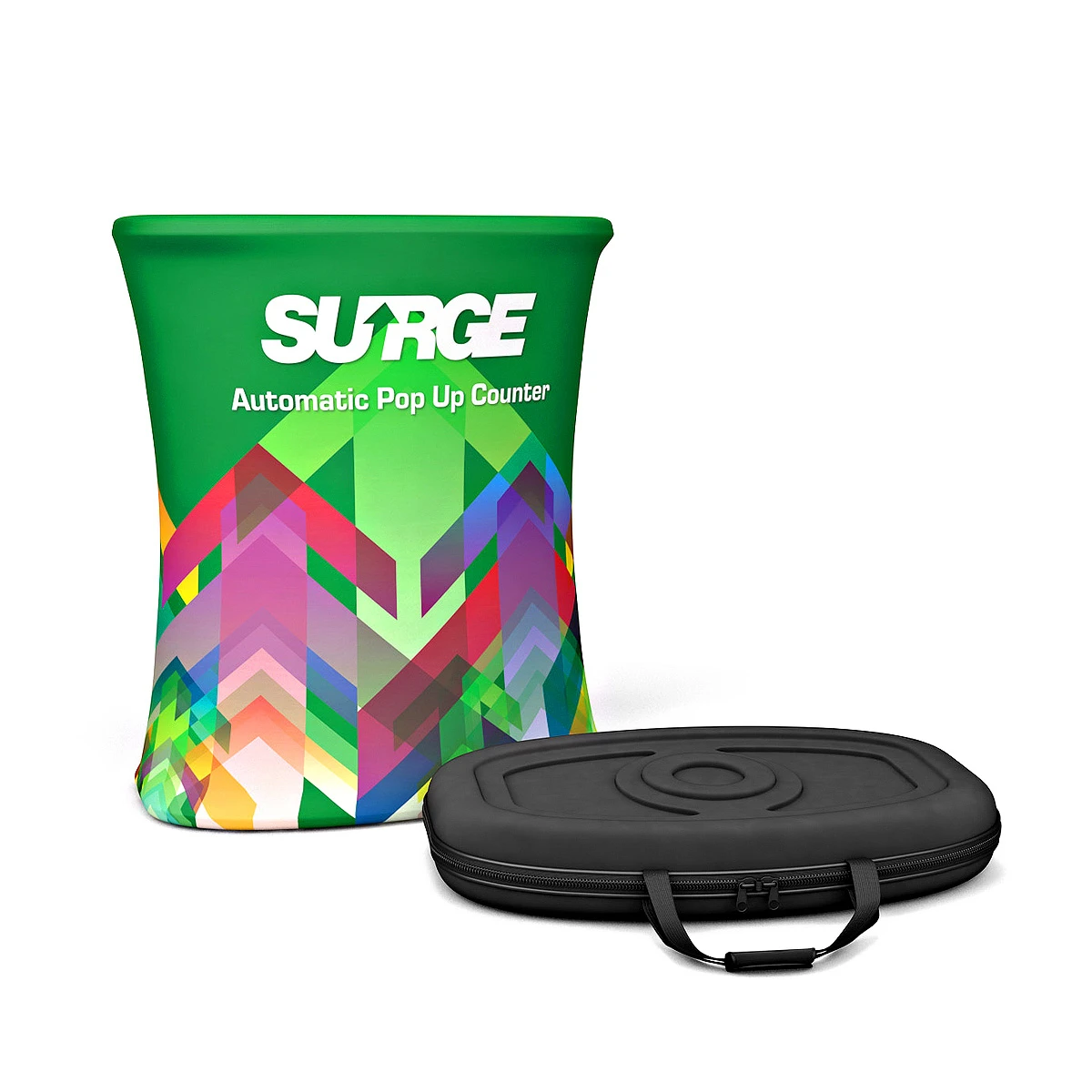 The benefits of the SURGE® Automatic Pop Up Counter are the instant set up, portability and convenience of use. The unique ability to leave the graphics installed and simply close the counter and place it in the supplied carry case after use, means it is instantly ready to go for your next event or exhibition. There is no need to remove the printed fabric graphic to assemble or dismantle this promotional counter display.