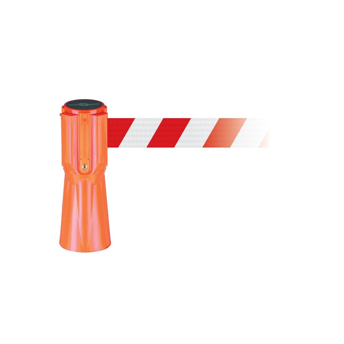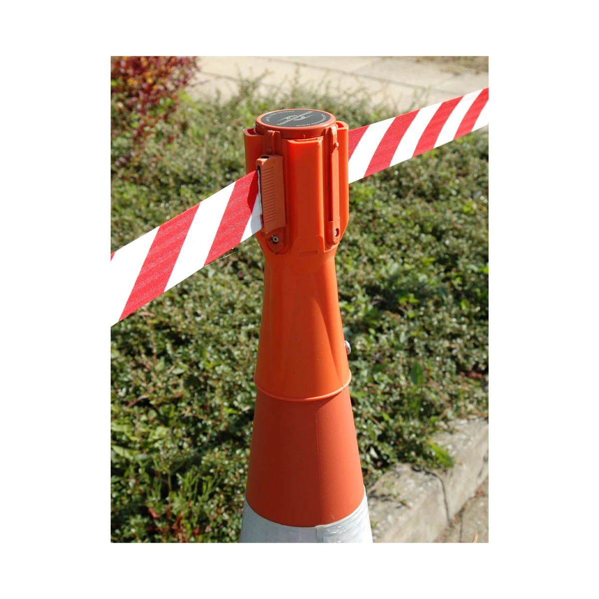 The Tensa Traffic Cone Topper Safety Barrier is part of the Tensabarrier® system; a collection of products designed with unique, market-leading safety features. The Tensa Traffic Cone Topper Safety Barrier has a four-point modular anti-tamper webbing connectivity cassette, which comes as standard with an anti-tamper tape end, preventing accidental release of the retractable webbing. In addition, it includes the Tensabarrier® patented braking system, which uses twin brake shoes to make sure that the webbing belt end cartridge falls directly to the floor upon release, then retracts slowly back into the cassette, rather than pinging quickly back into place in a manner which could cause injury.Â