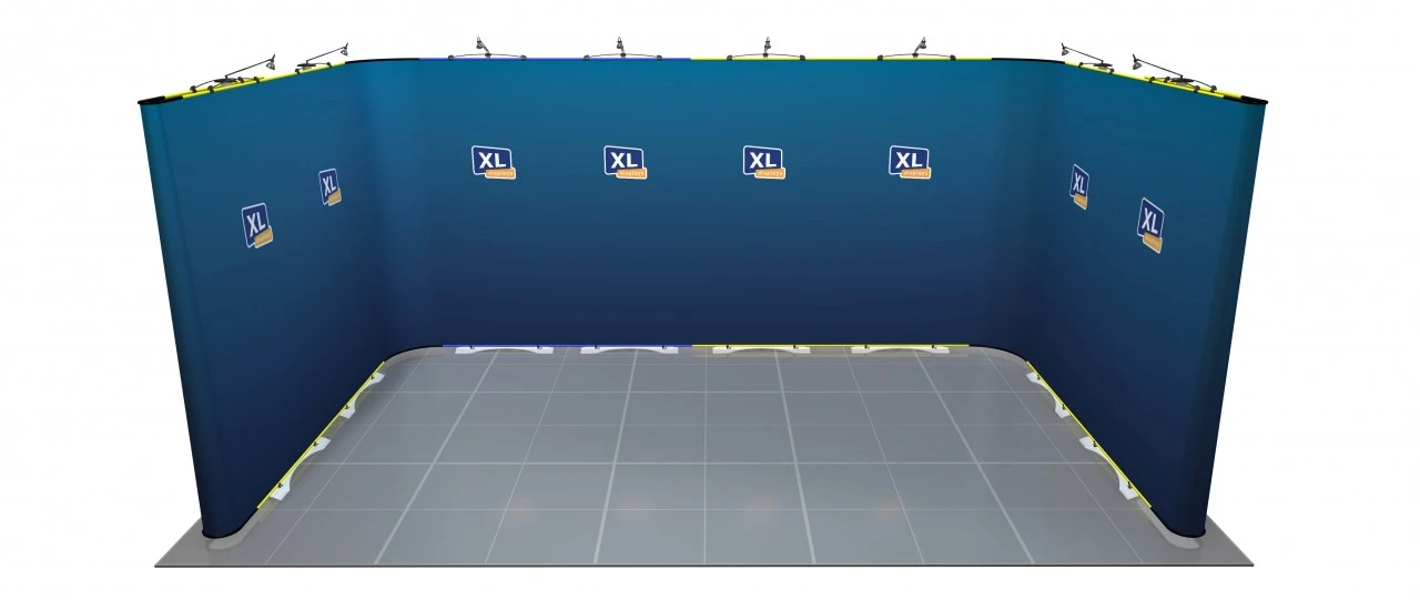 This Twist flexible display stand has been designed to fulfil a 5m x 3m shell scheme or exhibition space. Modular exhibition stand which allows you to configure your Twist banner system to suit any stand shape or size you require.