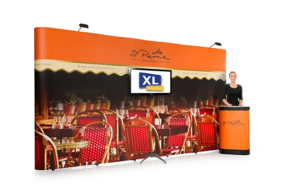The freestanding monitor stand can be integrated with our straight pop up displays, allowing you to engage with attendees through the use of promotional audiovisual content. The monitor stand sits behind the pop up with two feet coming through the front of the graphics. We can custom finish your graphics to accommodate the TV stand to give an almost seamless look to your pop up a stand or printed display. For more information on integrating this TV stand with a pop-up standcontact us on .